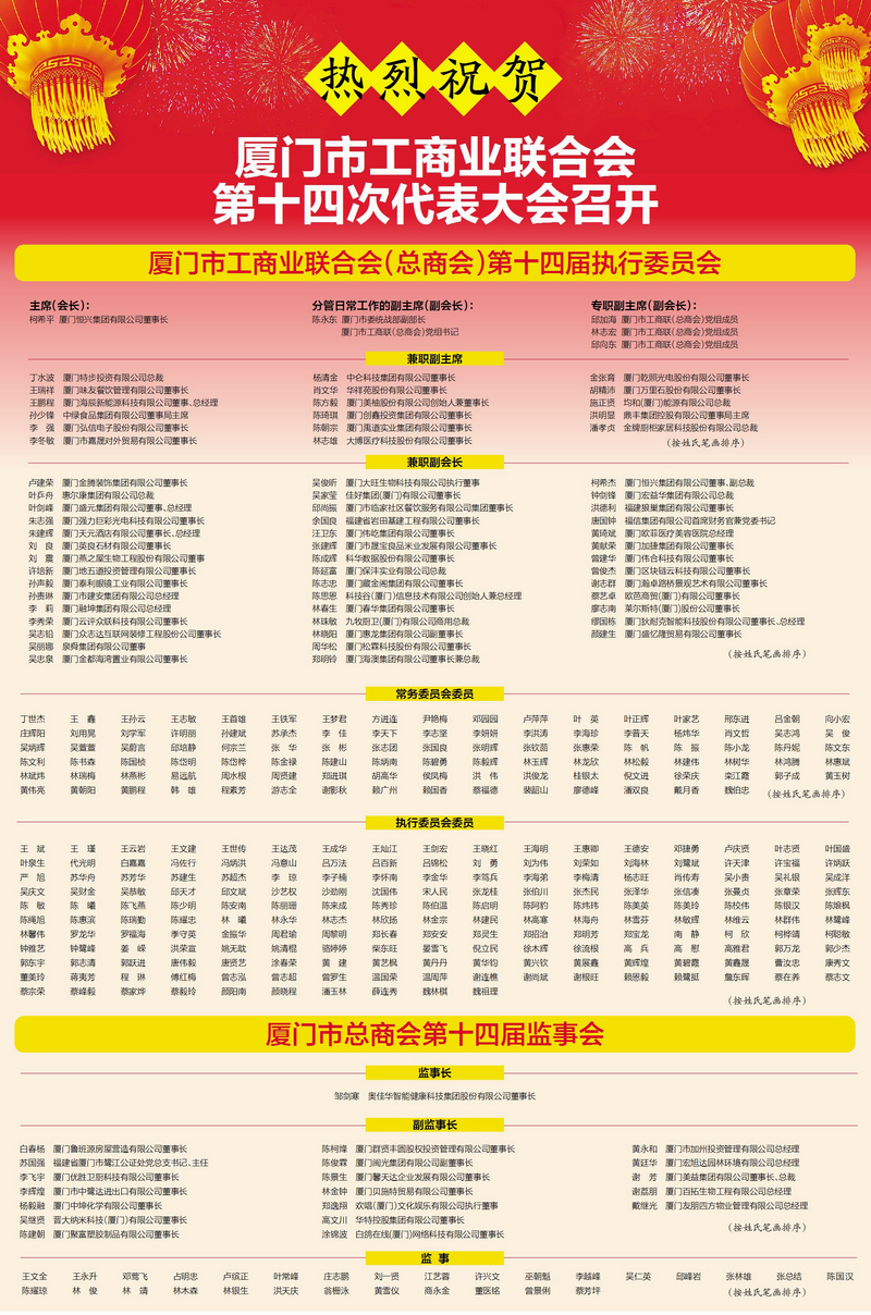 會議選舉產生廈門市工商業聯合會(總商會)第十四屆執行委員會、廈門市總商會第十四屆監事會組成人員,恒興集團董事長柯希平連任主席(會長),奧佳華集團董事長鄒劍寒當選監事長。